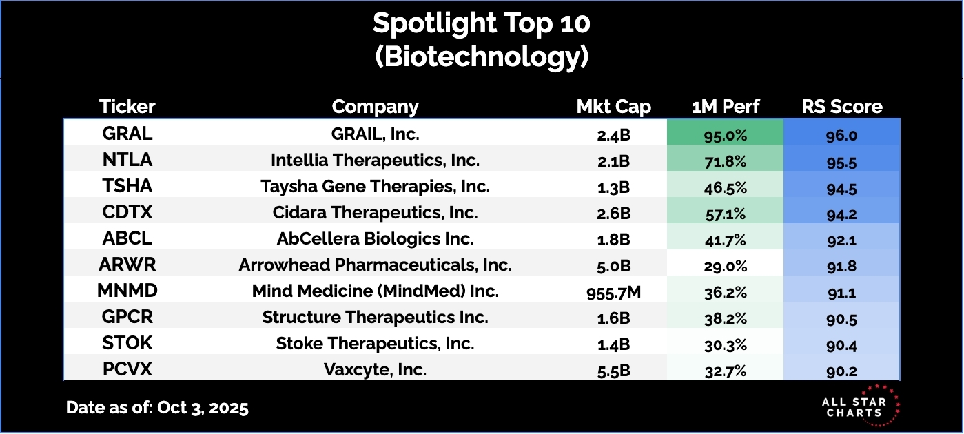 Biotech is the wild side of Healthcare — high-beta, high-risk, and usually the first place money flows when investors are on offense. So it makes sense to see the subsector toward the top of our rankings, acting as early leaders for their peer group. Here are the Top 10 names in the Biotechnology subsector, ranked by relative strength.