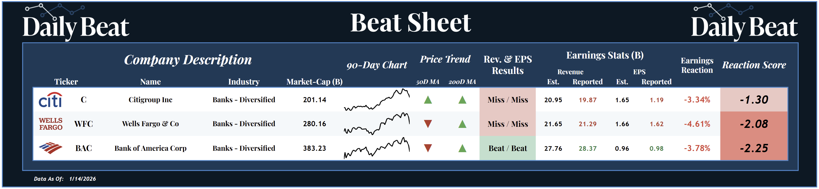 *Click the image to enlarge it Following Tuesday's bloody Beat Sheet, we saw more pain on Wednesday. The $201 bank, Citi $C, had the least-terrible earnings reaction. Following a big double miss, shareholders were punished with a -1.30 reaction score. The company reported $19.87B in revenues, missing the expected $20.95B, and earnings per share of $1.19, missing the expected $1.65. At the bottom of Wednesday's Beat Sheet was the $383B bank, Bank of America $BAC. After beating headline expectations, shareholders suffered a -2.25 reaction score. Revenues came in at $28.37B, missing the expected $27.76B, and earnings per share of $0.98, missing the expected $0.96. Let's talk about what else happened ๐ |