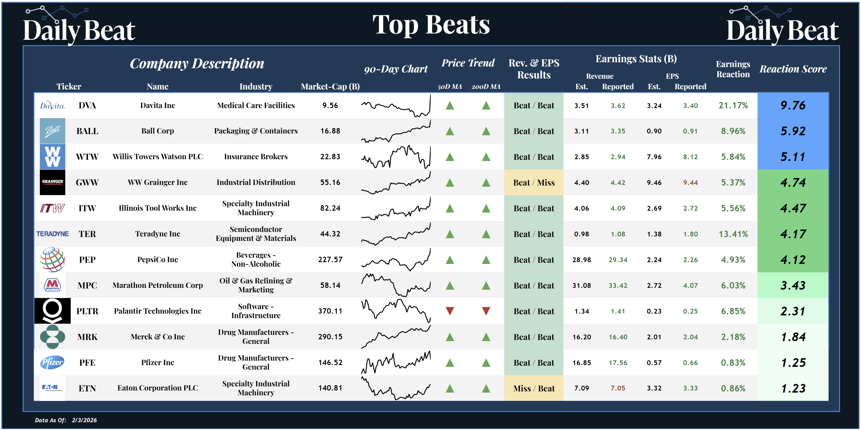 *Click the image to enlarge it Tuesday's top beat came from the $9.6B dialysis services provider, DaVita $DVA. After crushing expectations across the board, shareholders were rewarded with a remarkable +9.76 reaction score. This was one of the highest reaction scores we've seen all earnings season. In the report, DVA posted revenues of $3.62B, beating the expected $3.51B, and earnings per share were $3.40, above the expected $3.24. We also saw big beat/beat/pops from two of the largest pharma stocks, Merck $MRK and Pfizer $PFE. And the $370 software giant Palantir $PLTR posted another blockbuster earnings report and rallied nearly 7%. |