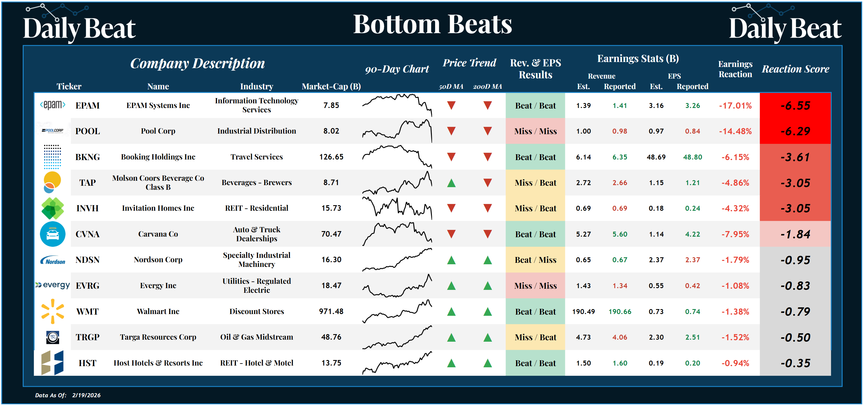 *Click the image to enlarge it Thursday's bottom beat came from the $8B tech stock, EPAM Systems $EPAM. Despite a big double beat, shareholders suffered a -6.55 reaction score. EPAM reported revenues of $1.41B, beating the expected $1.39B, and earnings per share were $3.26, above the expected $3.16. The beatdown in Pool $POOL also stood out to us. Let's talk about what else happened π |