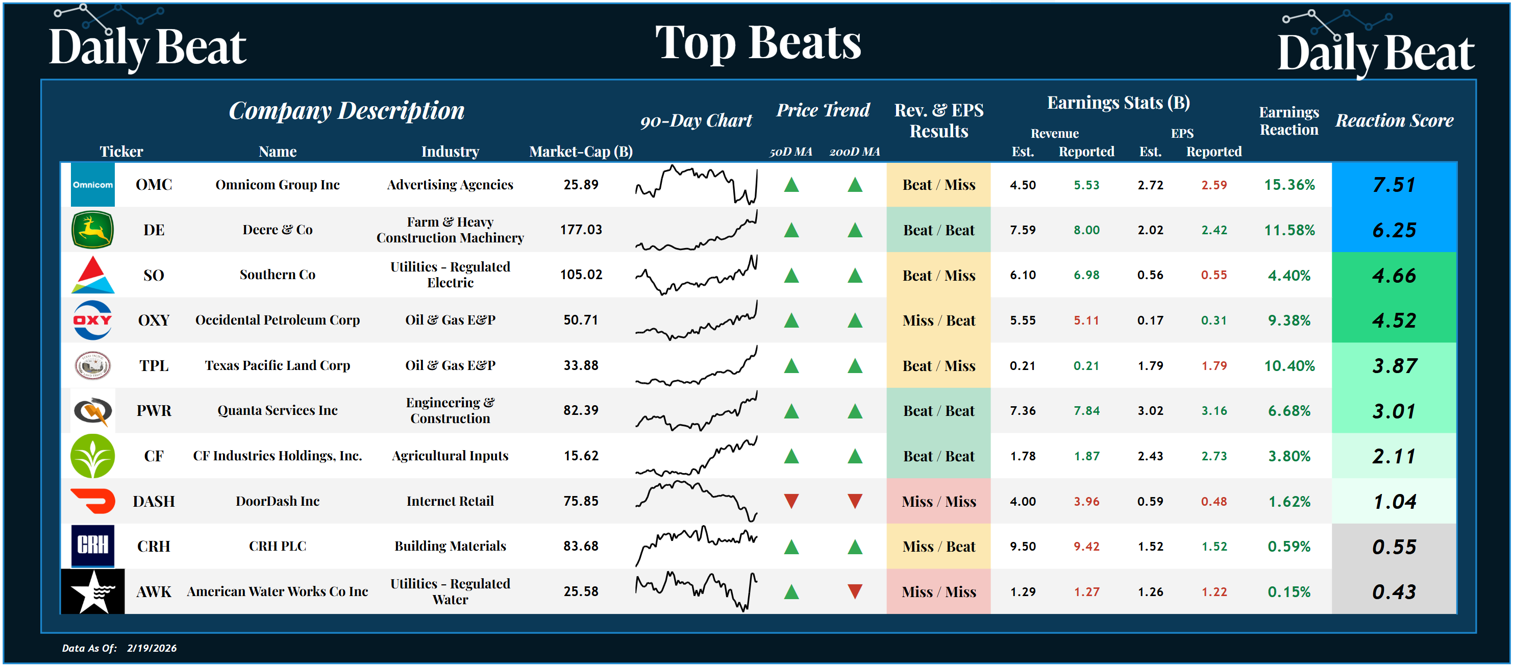 *Click the image to enlarge it Thursday's top beat came from the $26B advertising agency, Omnicom $OMC. After posting mixed headline results, shareholders were rewarded with a +7.51 reaction score. In the 8-K, OMC reported revenues of $5.53B, crushing the expected $4.50B, and earnings per share were $2.59, below the expected $2.72. The big beats from Deere $DE, Southern Co. $SO, Occidental Petroleum $OXY, and Quanta Services $PWR also stood out to us. |