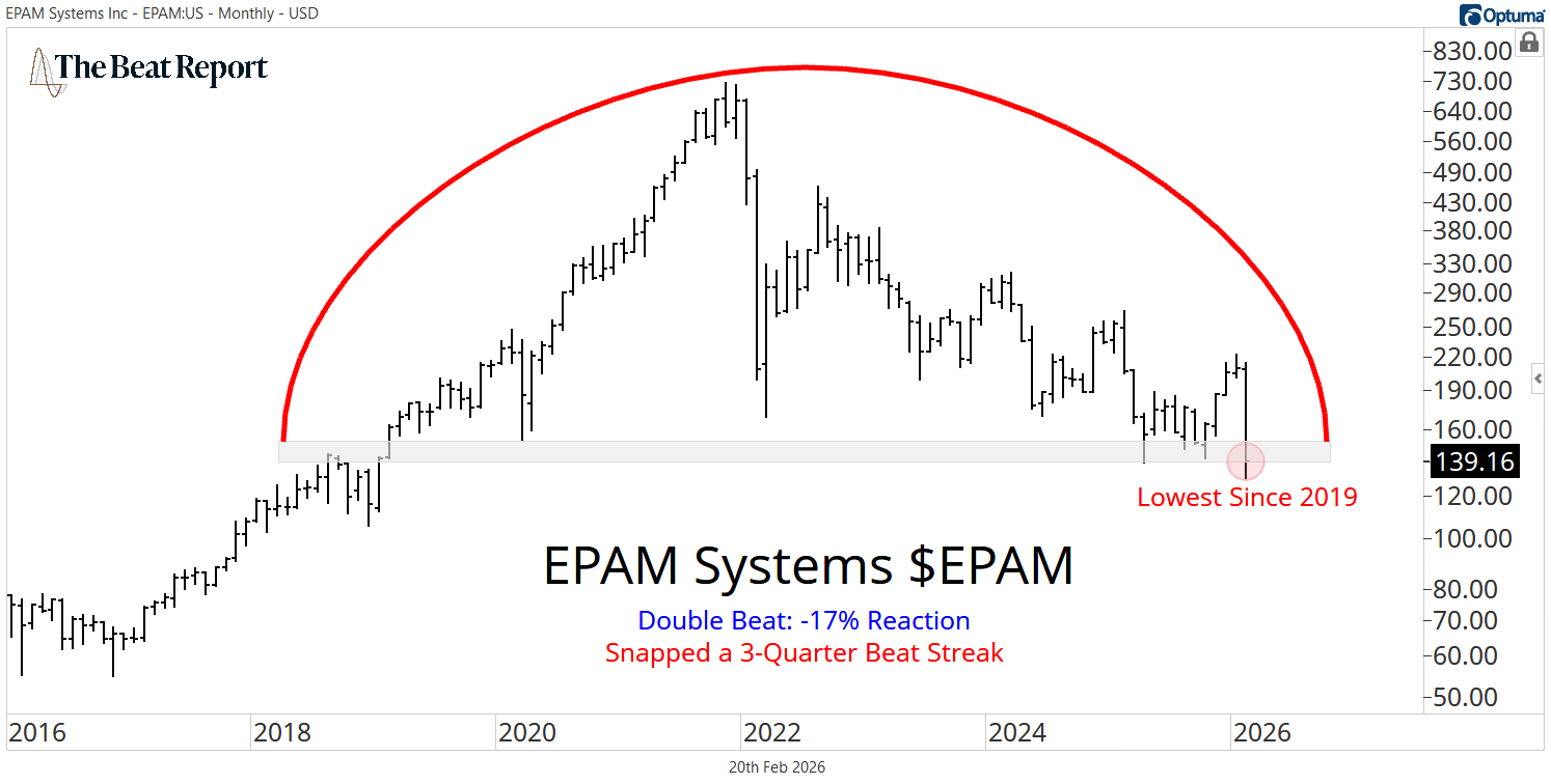 Like many other AI consultants, this company has been struggling for years. Since peaking in late 2021, the stock has cratered by more than 80%. And with the stock putting the finishing touches on a massive distribution pattern, it looks poised to decline even further. Over the past 3 quarters, earnings sentiment has been a tailwind. However, with this quarter's extremely negative earnings reaction, this is no longer the case. We expect EPAM's path of least resistance to remain lower for the foreseeable future. Happy Friday! -The Beat Team |