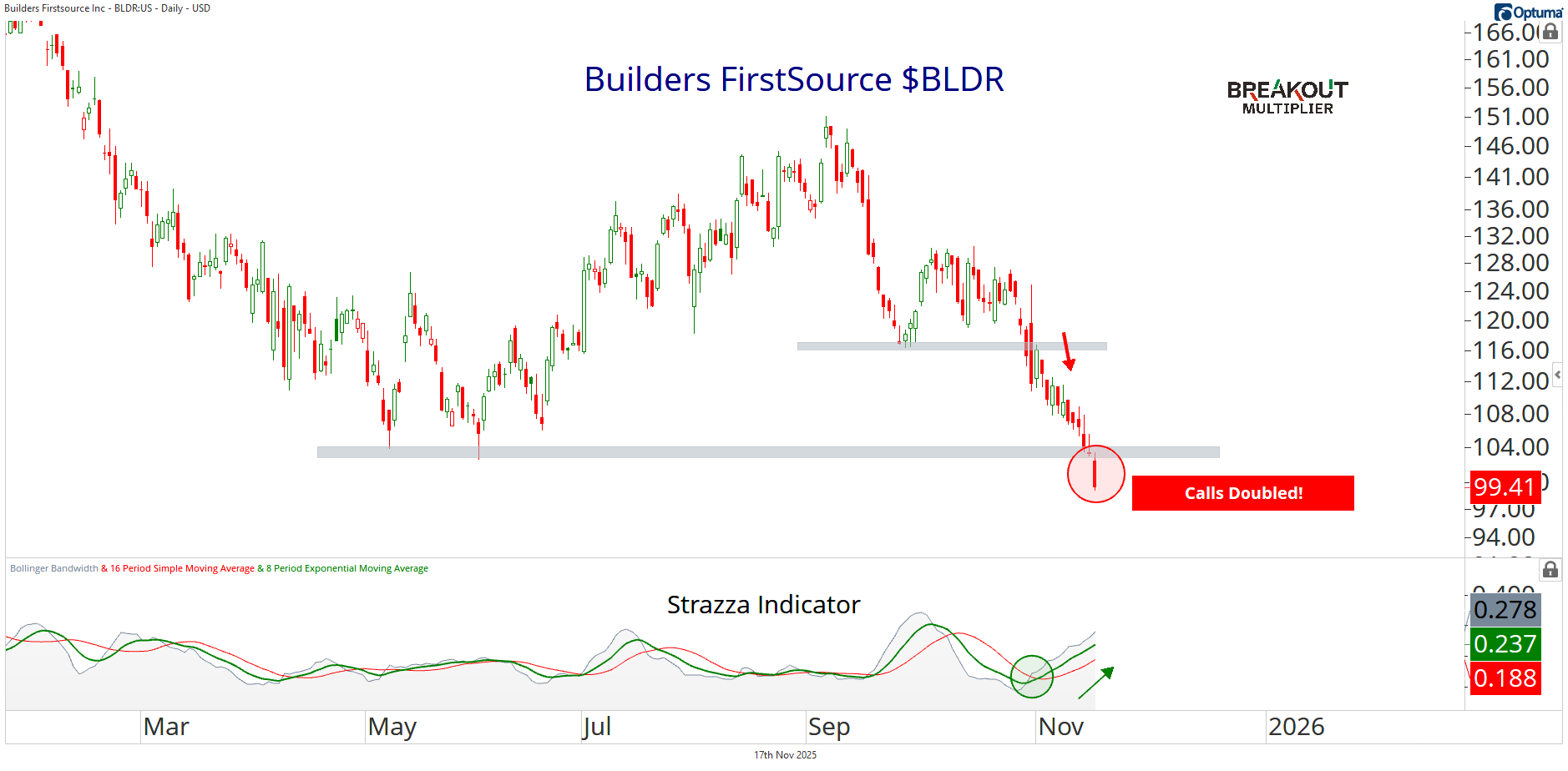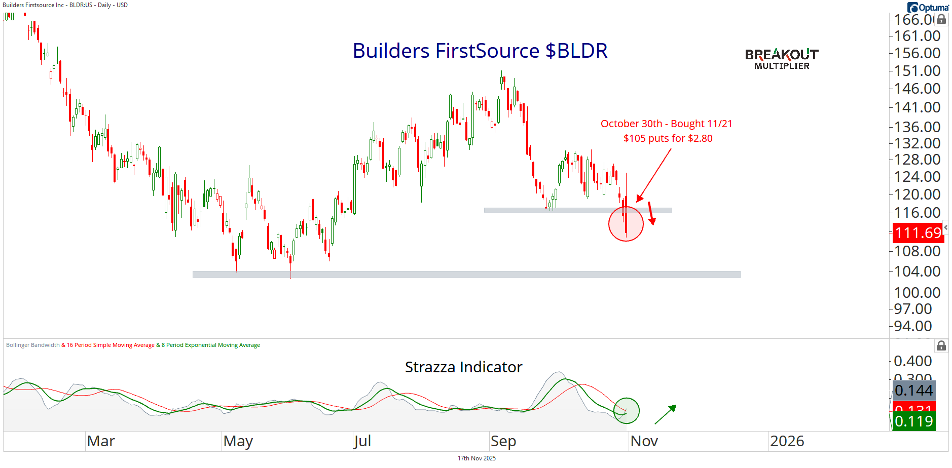 A few weeks ago, I made the decision to start mixing in some short trades with our longs. I've grown increasingly cautious on the market, and thought it was prudent to have some bearish exposure in the portfolio for the first time since March. As it turns out, that couldn't have been more timely. Right now, shorts are the only thing working. On October 30th, I bet against two of the most vulnerable areas: Bitcoin and Builders.. One of our vehicles for this was Builders FirstSource $BLDR, which is one of the weakest players in our housing universe. This is what it looked like when we entered. |