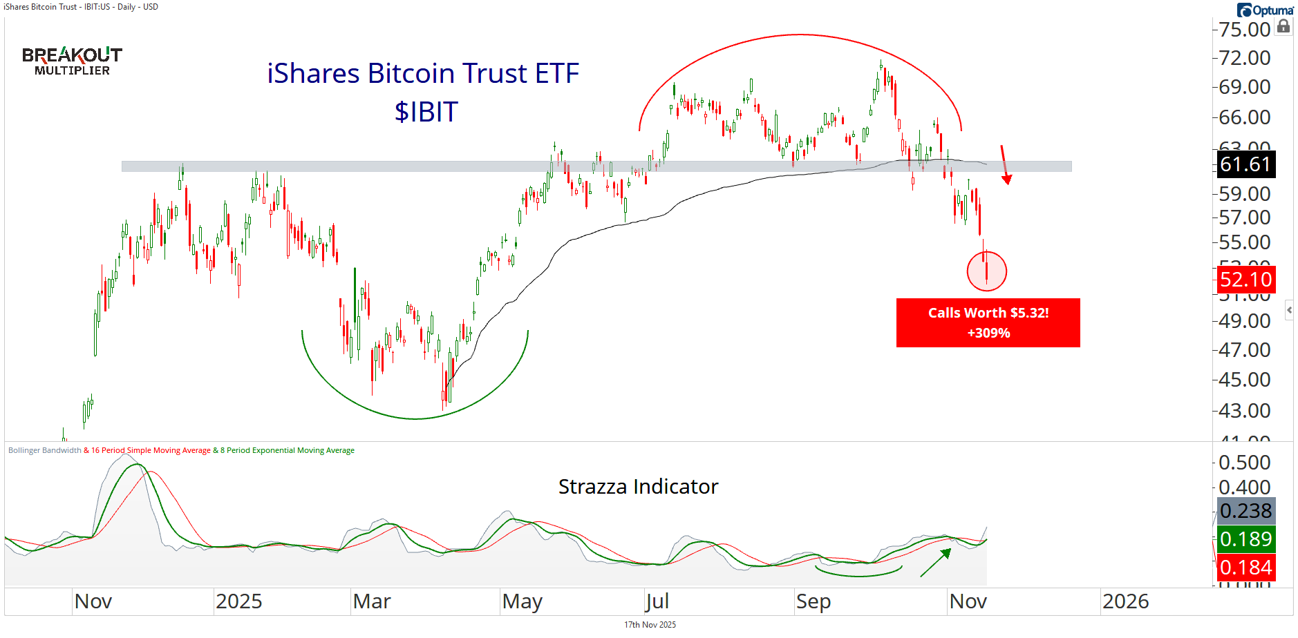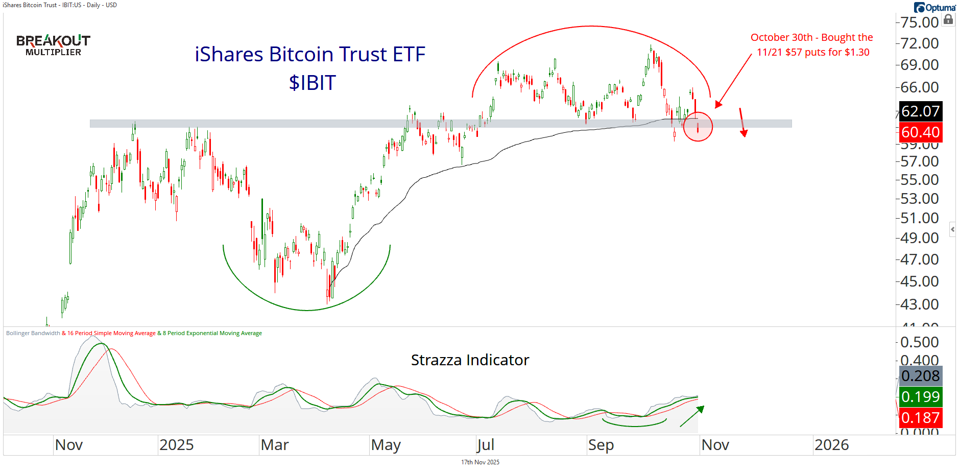 I grabbed the IBIT 11/21 $57 puts for $1.30. Today, BTC continued to tumble, and IBIT is currently trading around $52, putting us deep in-the-money. |
