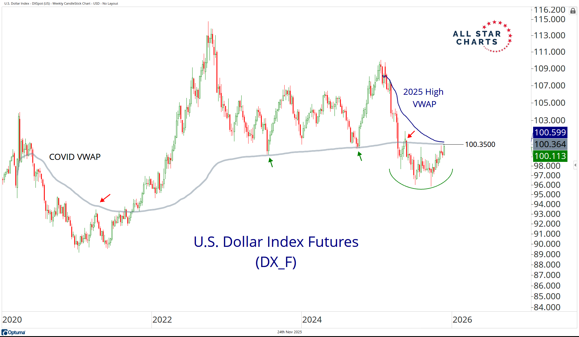 Historically, December is the worst month of the year for the Dollar. As we march into year-end, this seasonal headwind would favor these tactical tops failing. If, however, the DXY continues its ascent, it might not only dampen the global risk asset party but could even place it on a prolonged temporary hold. Ultimately, price is what matters. We'll follow the price, not the calendar. Our line in the sand hasn't changed: the COVID-anchored VWAP near 100.50. |