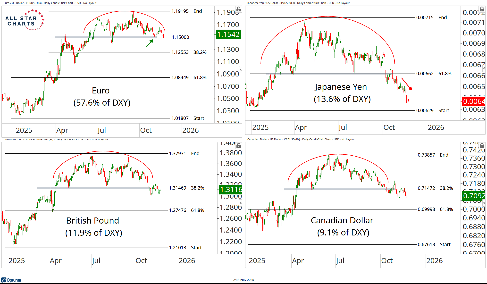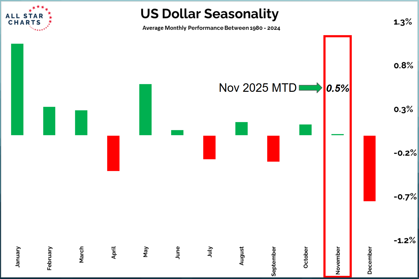 When the tape gets noisy, we like to simplify our process and let the most important charts do the talking. Many of 2025's best themes— Europe, Latin America, Asia, precious metals, commodity equities—have ridden a weak Dollar tailwind. Our base case is that it continues over the long term, but we're taking a more tactical look today. November is running hotter than usual for the US Dollar Index $DXY. Seasonally, the buck tends to cool into year-end, yet this month it's been firmer than the historical script, up around 50 basis points over its average. |
