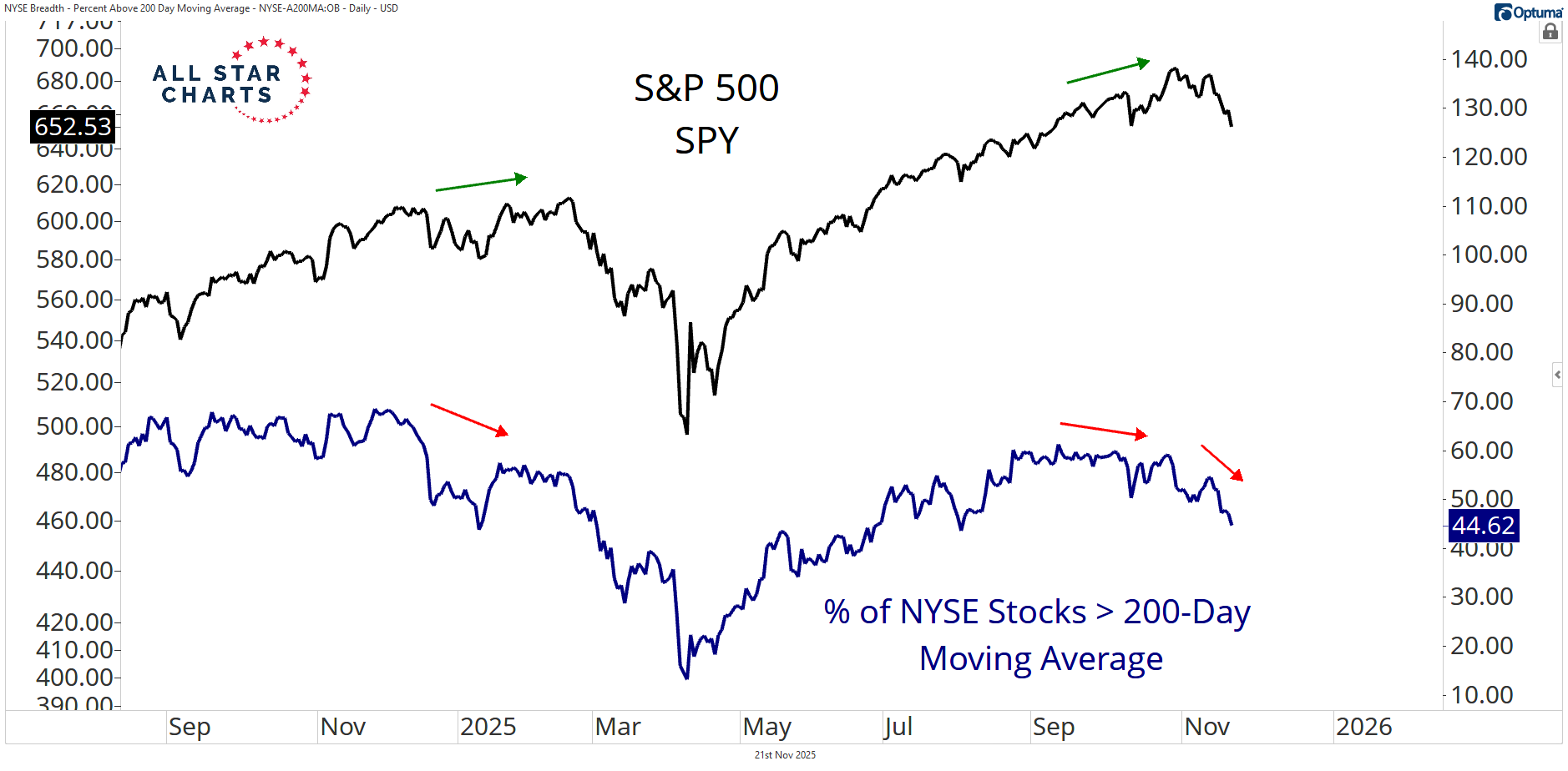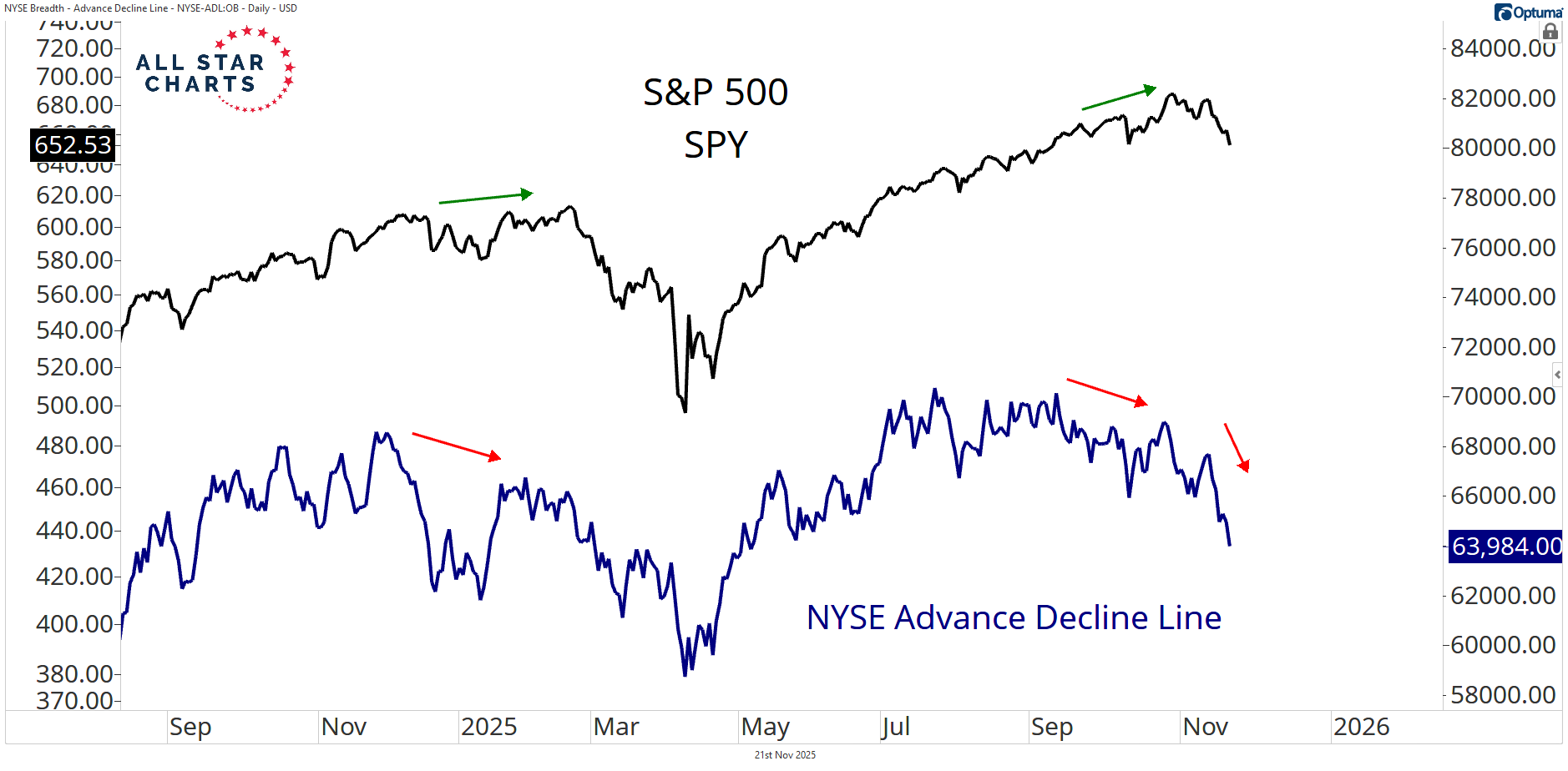 Divergence City The past month has been a tale of messy, choppy action for stocks. Some names are holding up fine, while others are getting hit hard. When things get this split, I like to look at market internals. That's where you really see what's happening beneath the surface. The Advance-Decline line is a good place to start. It measures breadth by tracking cumulative net advances over time. Right now, the NYSE Advance-Decline line is sitting at new 6-month lows. |