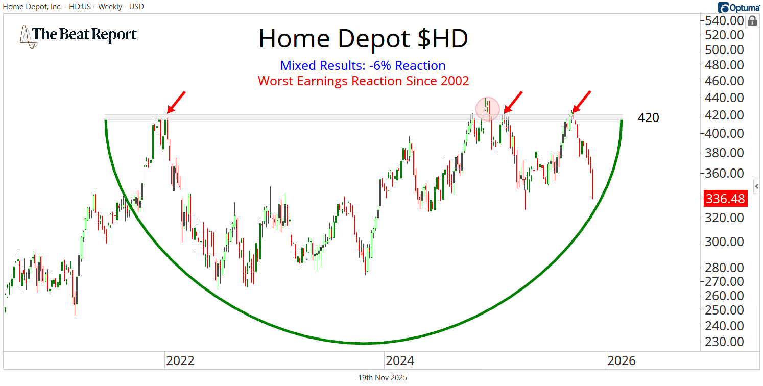 We highlighted this report in a recent Weekly Beat column, noting that the company has missed its EPS estimate in three consecutive quarters. Now it's four, and the market isn't happy about it. While we didn't expect the stock to rally after its earnings report, we didn't expect it to be this bad. This was the worst earnings reaction in decades! The stock is in the middle of a big, messy range, and we see no reason for that to change anytime soon. So long as HD is below 420, we expect the price action to be messy. Thank you for reading -The Beat Team |