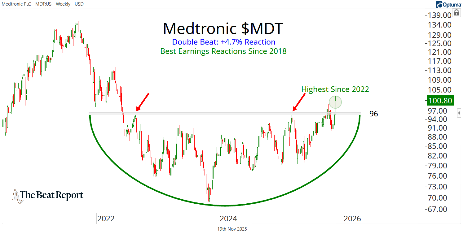 This has been one of our favorite bearish-to-bullish reversal patterns in the S&P 500 for months, but it was clear that the buyers needed a catalyst to take control of the primary trend. As it turns out, this quarter's earnings report was the catalyst they'd been waiting for. Not only did the company beat and raise, but the stock had its best earnings reaction in years. Now the bulls have a green light! With MDT trading at the highest level since 2022, the path of least resistance is higher for the foreseeable future. |