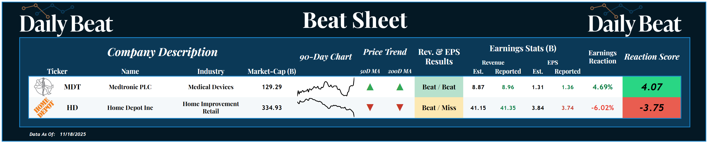 *Click the image to enlarge it Tuesday's top beat came from Medtronic $MDT, a $129B medical devices stock. The company beat expectations across the board, and shareholders were rewarded with a +4.07 reaction score. In the report, they posted revenues of $8.96B, beating the expected $8.87B, and beat earnings per share expectations by 5 cents. At the bottom of Tuesday's list was the $335B home improvement retail giant, Home Depot $HD. Following a mixed earnings report, the market punished shareholders with a -3.75 reaction score. Now let's dive into the fundamentals and technicals 👇 |