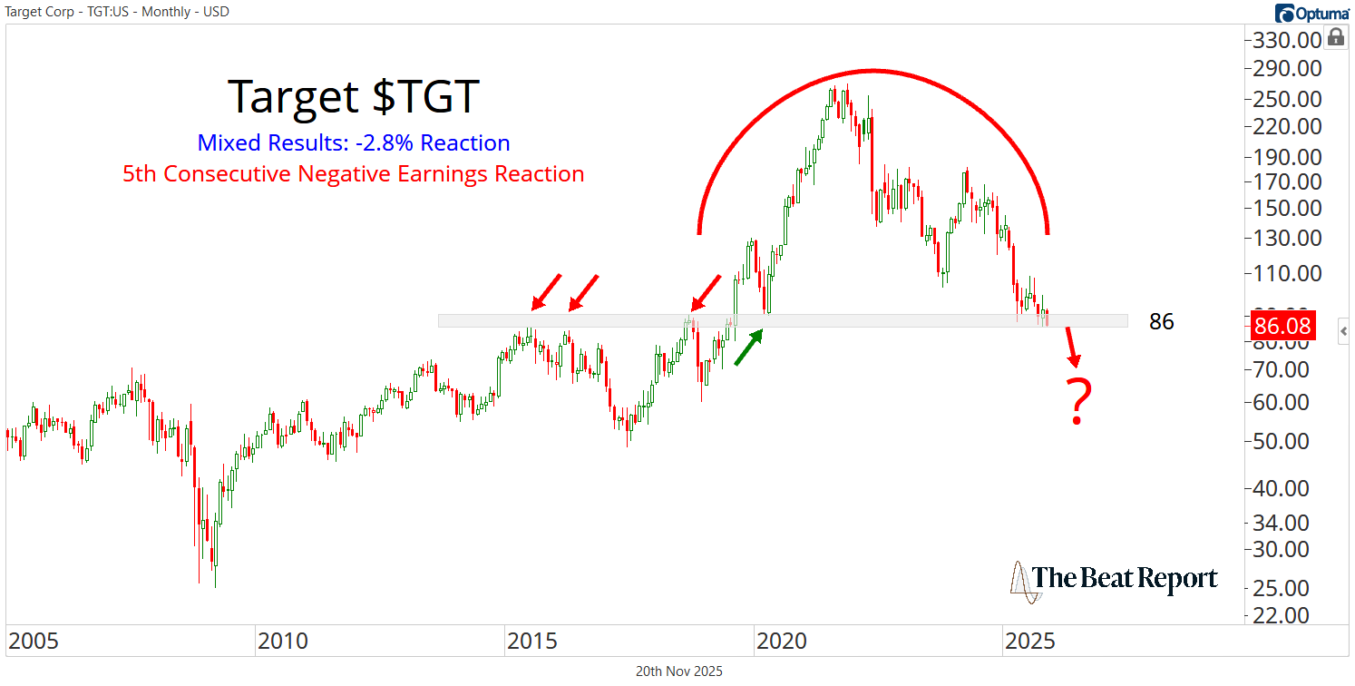 This has been one of the largest disasters in retail for years, and nothing about that changed this quarter. If anything, the fundamental and technical deterioration is accelerating. Mr. Market has punished the shareholders with one of the longest beatdown streaks in the S&P 500, confirming the negative fundamental and technical outlook. The stock is on the cusp of resolving a massive top, which would likely lead to a further decline. Things don't look good for this name! If TGT slips below 86, we expect a fresh leg lower. Thank you for reading -The Beat Team |