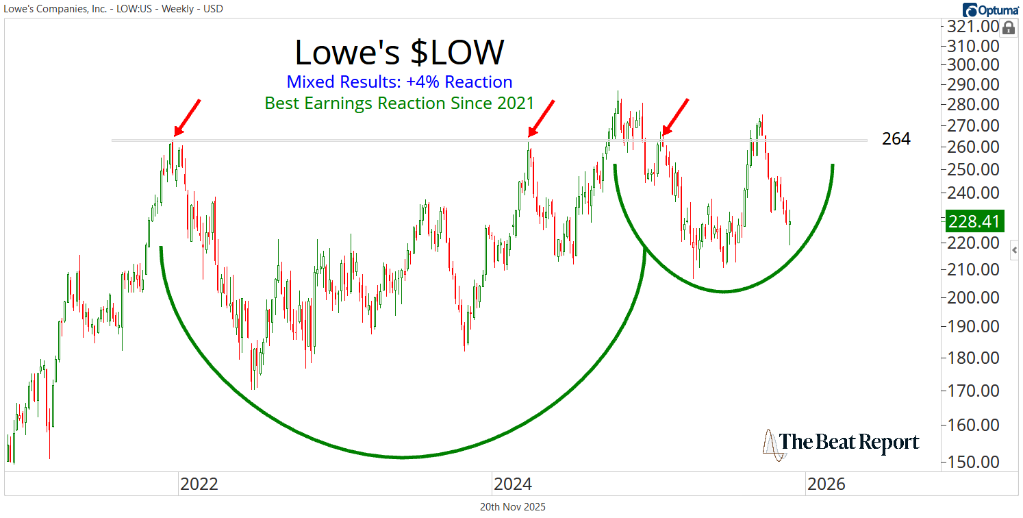 In yesterday's Daily Beat, we highlighted Home Depot $HD and its horrific beatdown. The stock had its worst earnings reaction since 2002 after the management team issued worse-than-expected forward guidance. The bar was set extremely low for LOW, which they leaped over with ease, and the market loved it. Shareholders were rewarded with the best earnings reaction in years. And while the stock is still stuck in a massive range, it's not falling apart like its peer, HD. That's relative strength. So long as LOW is below 264, the path of least resistance is likely to remain sideways for the foreseeable future. | |