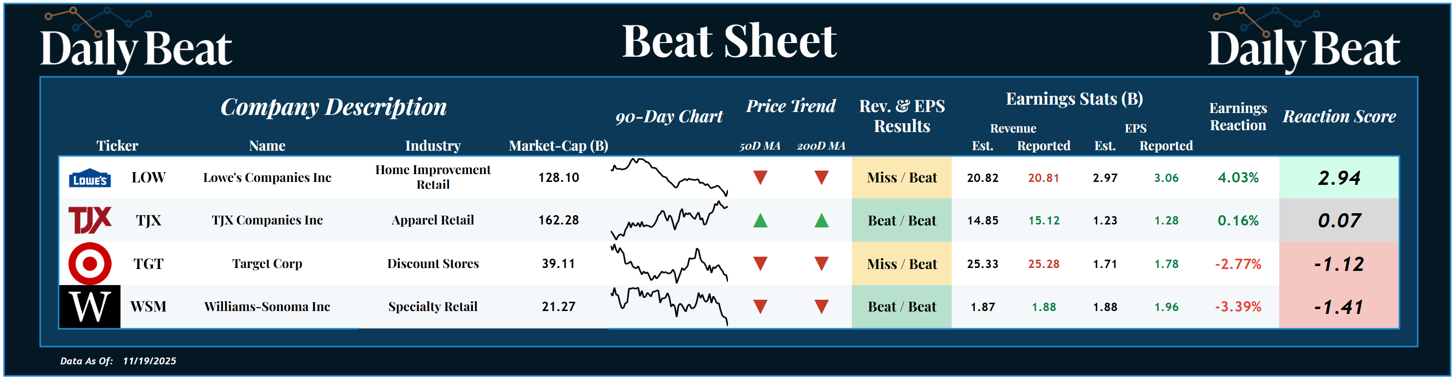 *Click the image to enlarge it Wednesday was all about retail... The top beat came from Lowe's Companies $LOW, a $128B home improvement retail stock. The company had mixed headline results, but shareholders were rewarded with a +2.94 reaction score. In the report, they missed revenue expectations by a nose hair and beat earnings per share expectations by 9 cents. At the bottom of Wednesday's list was the $21B specialty retailer, Williams-Sonoma $WSM. Following a double, the market punished shareholders with a -1.41 reaction score. Target $TGT was another beatdown that caught our attention. Now let's dive into the fundamentals and technicals 👇 |