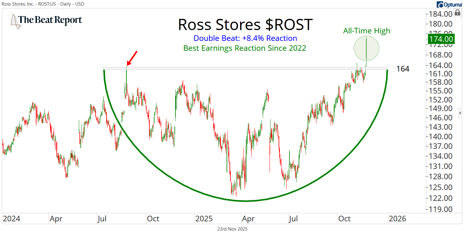 Like Walmart $WMT last week, this company absolutely crushed market expectations, and shareholders were rewarded handsomely. These strong fundamentals aren't anything new, though... The stock has been rewarded for 11 of the last 16 earnings reports, one of the best track records in the S&P 500. Not only was this the best earnings reaction in years, but it also completely changed the technical outlook. This was a textbook gap-n-go from a prolonged accumulation pattern, shifting our bias higher for the foreseeable future. So long as ROST holds above 164, the buyers are in complete control of the primary trend. |