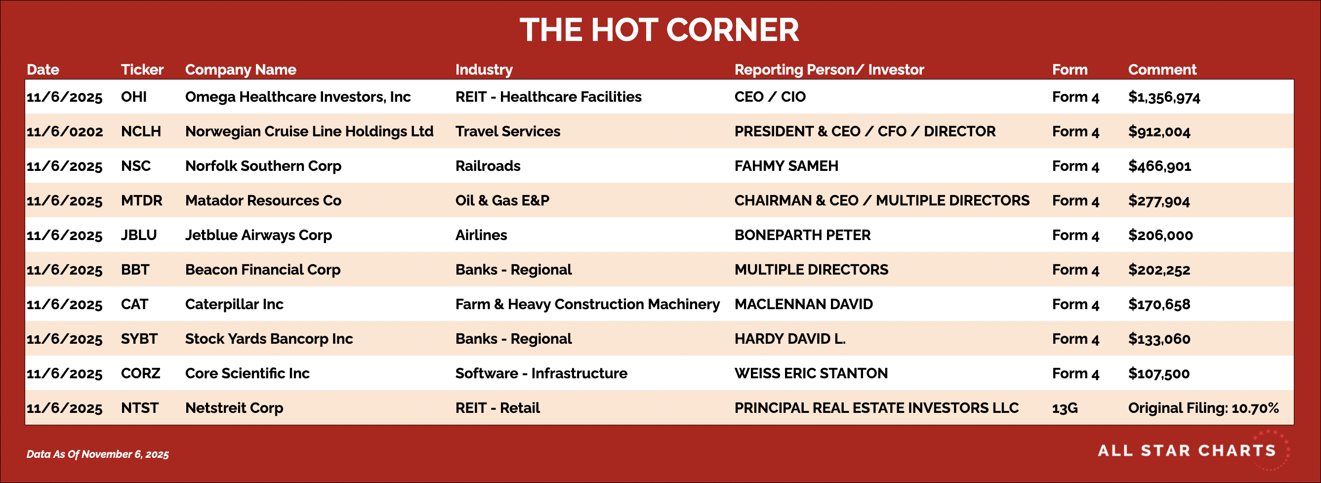Big insider support from the top deck — a confident show of alignment as the stock trades near multi-month lows after disappointing earnings. Here's The Hot Corner, with data from November 6, 2025: | Click the table to enlarge it. |