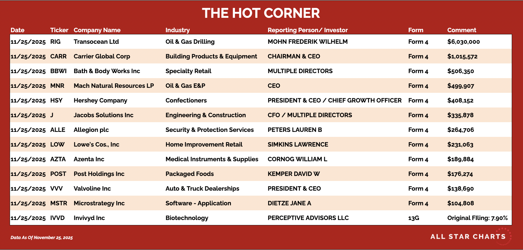 A small but timely addition with the stock printing new 52-week lows. MSTR has been unwinding sharply, and any insider activity at these levels feels stands out. Here's The Hot Corner, with data from November 25, 2025: |
