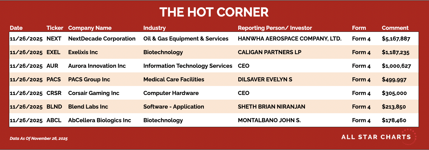 The activist value fund added again, right as EXEL works through the final stages of a massive dot-com-era base. A meaningful spot on the chart. Here's The Hot Corner, with data from November 26, 2025: |