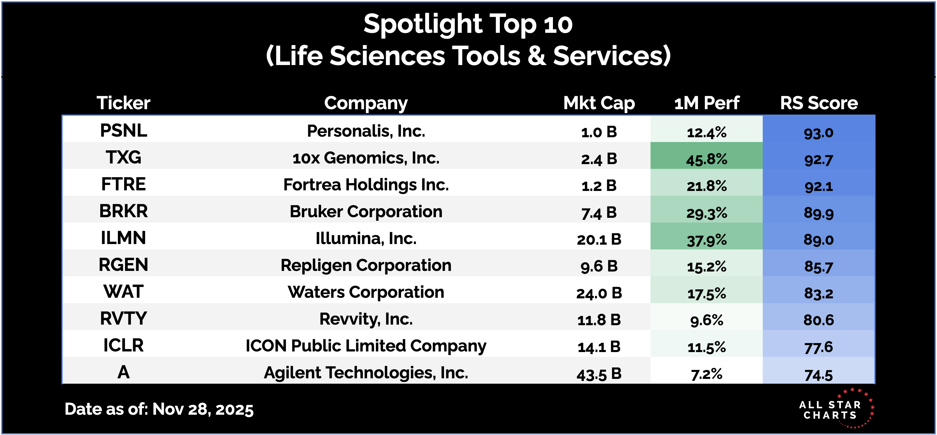 This remains among the strongest pockets within Healthcare — a diverse group of names, many of them resolving higher from clean consolidations and showing powerful follow-through. Here are the Top 10 names in the Life Sciences Tools subsector, ranked by relative strength.