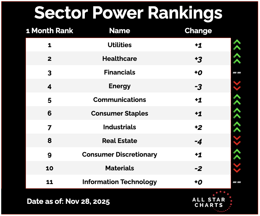 We continue to lean into Healthcare as relative strength keeps expanding to more stocks. . $XLV finished the month as the best-performing sector, closing at fresh all-time monthly highs, reasserting its leadership. Here's a look at our overall industry rankings, which show Life Sciences Tools stocks pushing into the top 3.