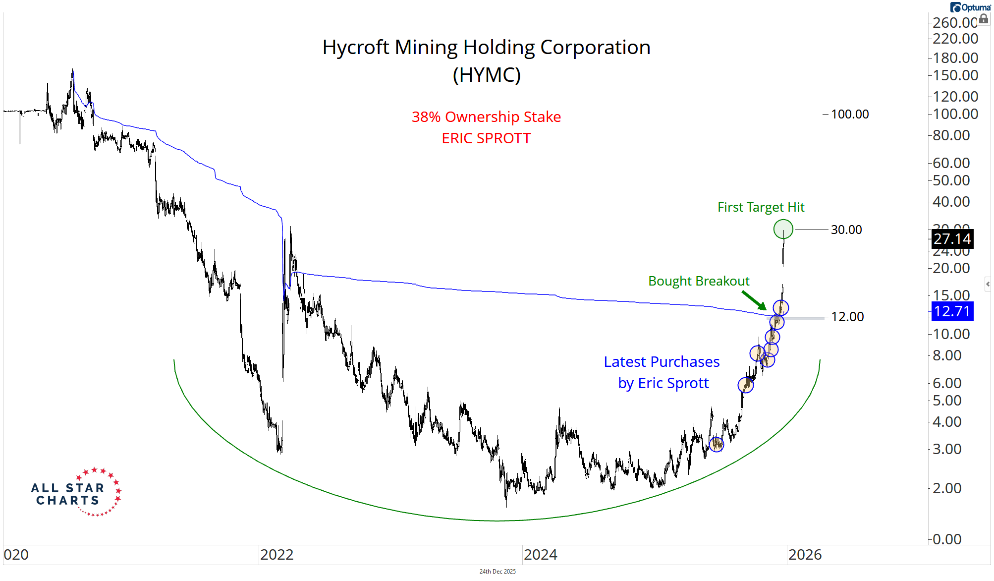 Hot Corner members are cashing in on a +150% move in $HYMC since December 8. We flagged this name in the Screamin' Hot Report before the breakout, while gold and silver miners were quietly emerging for a strong end-of-year rally. The tell? Accumulation. Eric Sprott — one of the most legendary metals investors on the planet — wasn't dipping a toe; he was building aggressively as price started a brand-new uptrend. We made it simple: only buy strength above 12, using the AVWAP from the all-time highs as our line in the sand. |