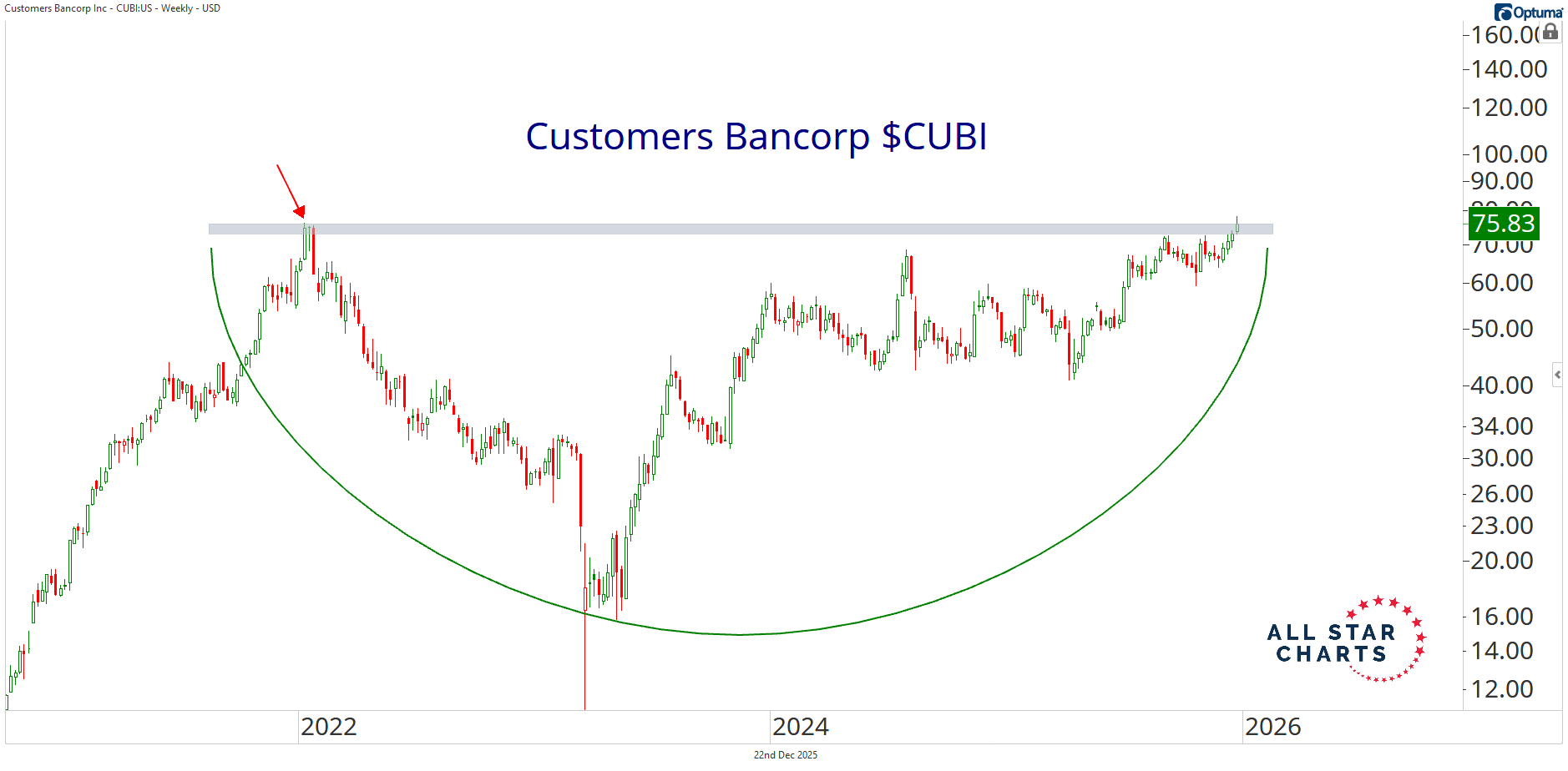 The bulk of the move usually happens late in the month — exactly where we are right now. So if the market finishes the year on a high note, it wouldn't be surprising at all. It would be right on script. Within that backdrop, banks have been one of the most consistent pockets of strength all year. Across the U.S., Europe, Japan, and Canada, bank stocks continue to act like leaders, not laggards. One setup that stands out right now is Customers Bancorp $CUBI. |