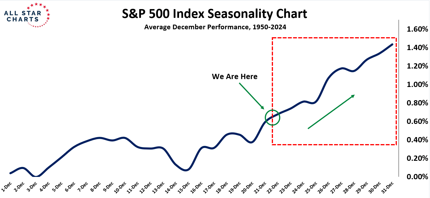 A Merry Rally for Stocks As we head into the final stretch of the year, offense is on the field. Trends remain intact. Participation is working. More stocks are setting up nicely. And the timing couldn't be better. From a seasonality standpoint, we're entering the window when equities have historically done their best work. Looking back to 1950, December has been a consistently positive month for the S&P 500. What's most interesting, though, is when those gains tend to show up. |