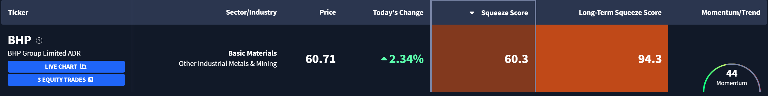 BHP Group $BHP is currently exhibiting a Long-Term Squeeze Score of 94.5. Here's what the chart looks like: |