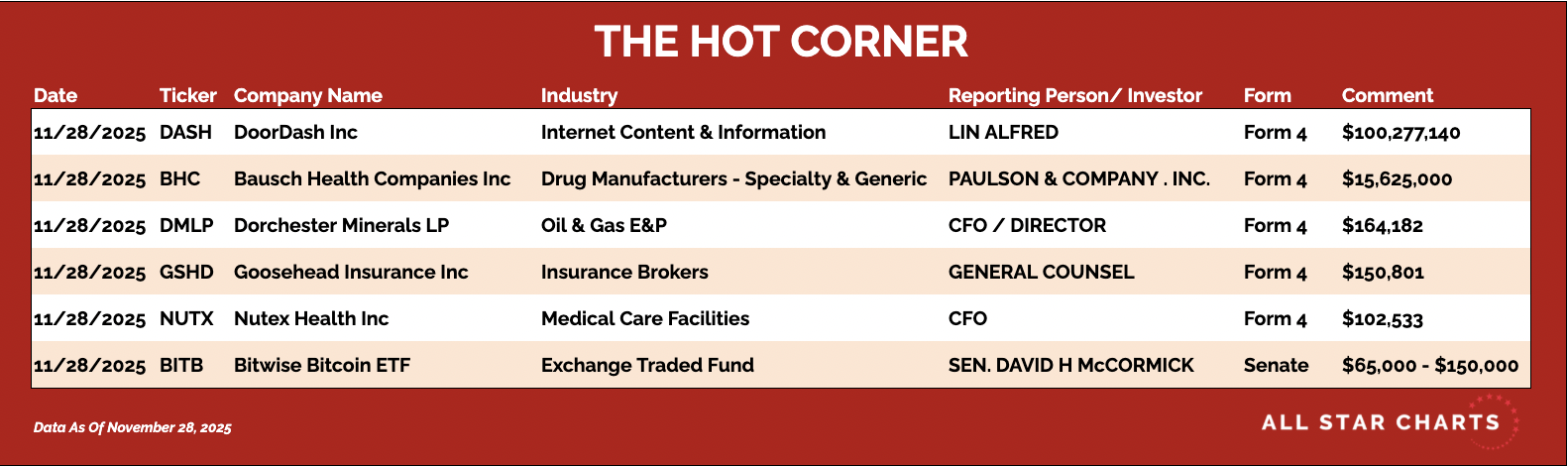 Longtime Sequoia Capital partner and a Director at DoorDash just filed a nine-figure insider purchase. This is one of the largest open-market buys we've seen all year. The timing stands out: DASH just failed to break out of a major base. 📌 Bausch Health $BHC — Paulson & Co. bought ~$15.6M.
