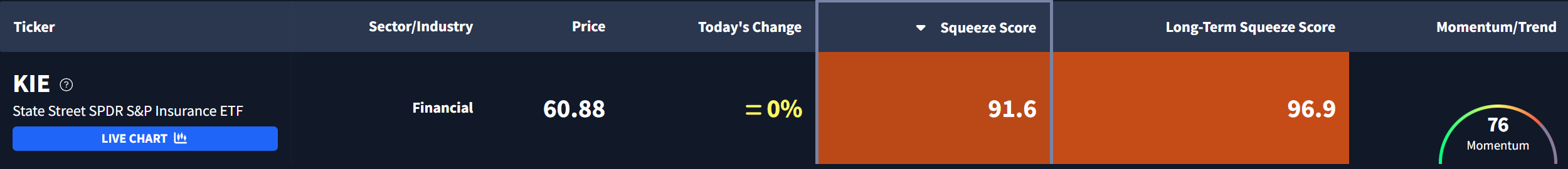 Insurance $KIE is currently exhibiting a Squeeze Score of 91.60 and an even tighter Long-Term Score of 96.90. Here's what the chart looks like: |