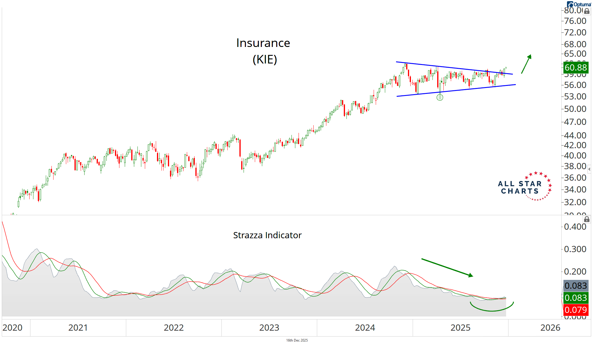 The Insurance ETF $KIE is coiled at its tightest volatility in years on the Strazza Indicator. This compression is occurring within the context of a strong structural uptrend. The year-long consolidation pattern has all the right ingredients for a potentially explosive resolution. We're already positioned in Financials, and we're prepared to add more exposure if our setups trigger.