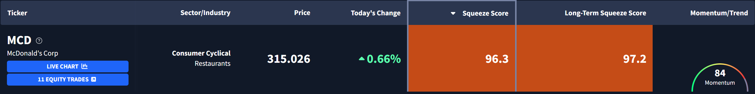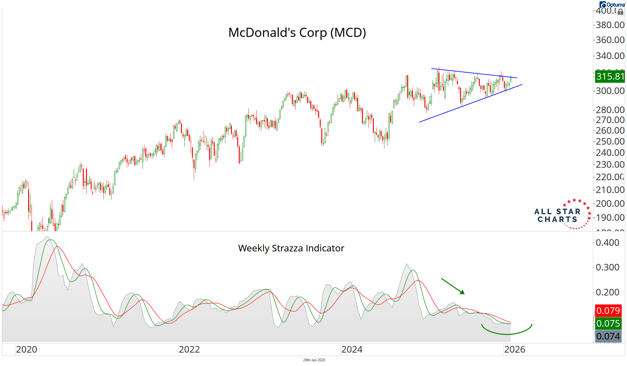 McDonald's Corp $MCD is currently exhibiting a Squeeze Score of 96.30 and an even Long-Term Squeeze Score of 97.20. Here's what the chart looks like: | McDonald's is coiled in a multi-month symmetrical triangle, with volatility on the weekly Strazza Indicator sitting at multi-month lows. A decisive resolution from this compression could spark the next major rally in a stock that has become a complete snooze fest. That's exactly the point of our strategy. We can take low-volatility, boring stocks and turn them into multi-baggers. Options level the playing field. If you want access to our Squeeze Engine and our next boring stock trade, join Breakout Multiplier here, risk-free. |