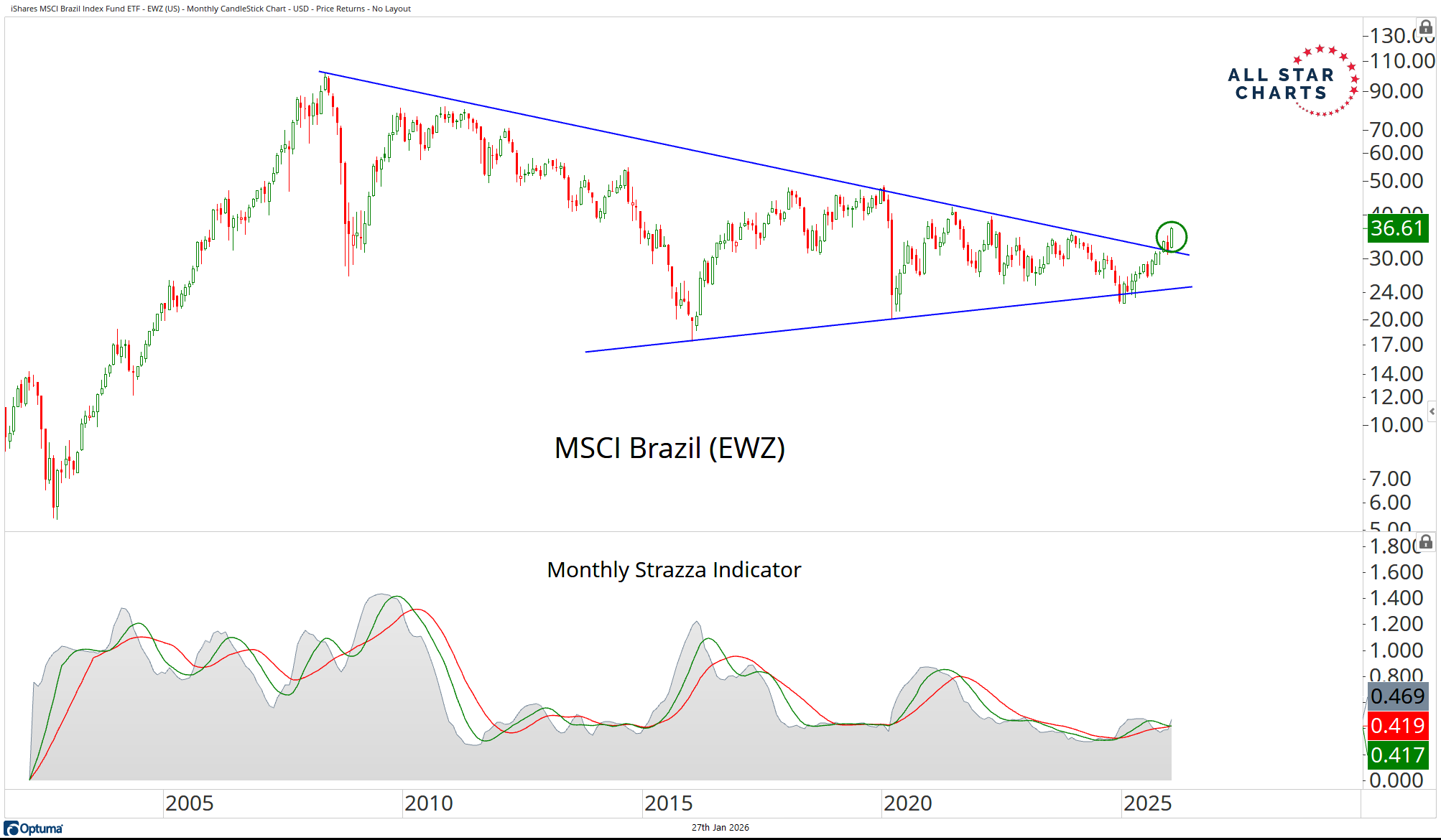 Brazil is breaking out of a massive, multi-decade downtrend line. Volatility on the Monthly Strazza Indicator remains compressed.