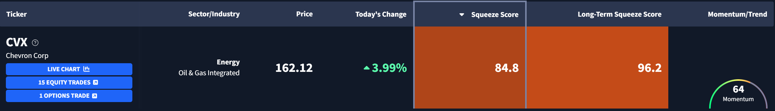 Chevron $CVX is currently exhibiting a Long-Term Squeeze Score of 96.2. Here's what the chart looks like: |