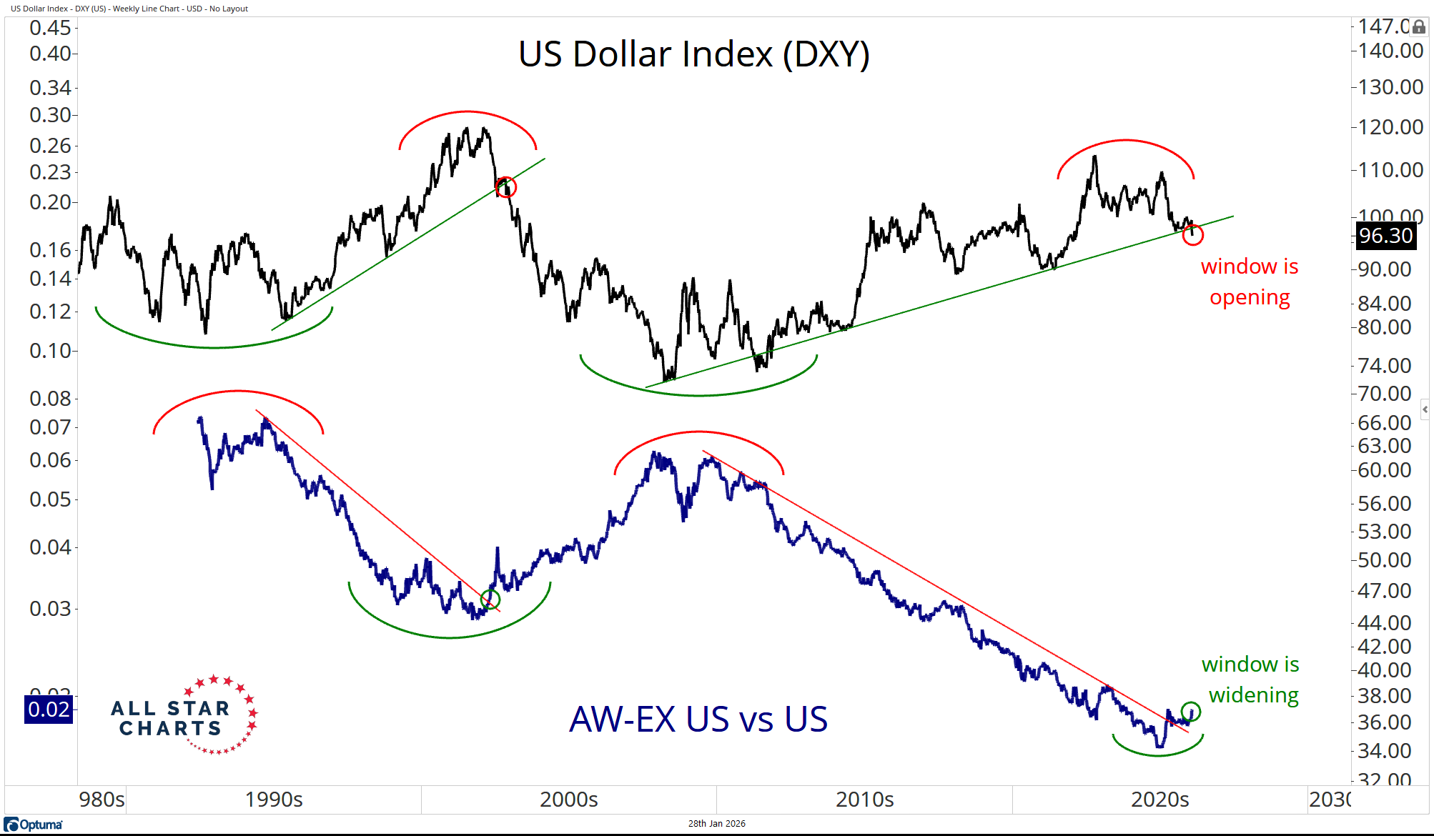 Here's the fat pitch: look at ex-US stocks versus US stocks overlaid with DXY. They're mirror images. When the Dollar weakens, the US typically underperforms the rest of the world.