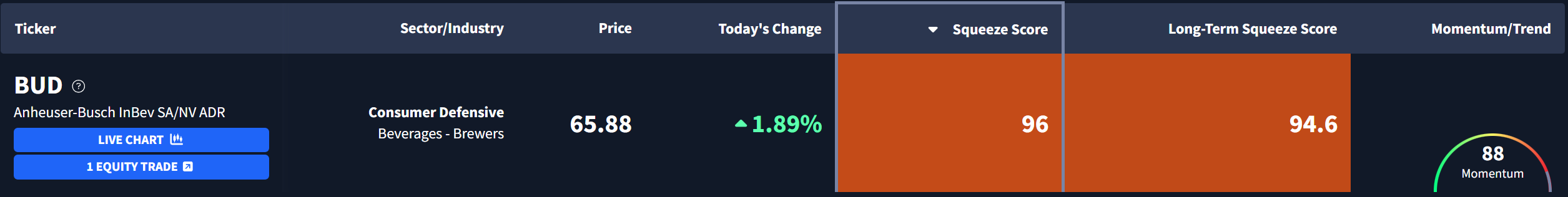 Anheuser-Busch InBev $BUD is currently exhibiting a Squeeze Score of 96 and an even tighter Long-Term Score of 94.6.
