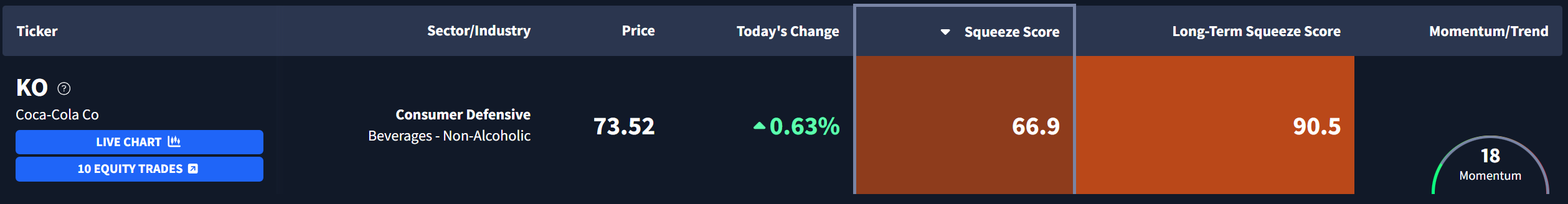 Coca-Cola $KO is currently exhibiting a Long-Term Squeeze Score of 90.5. Here's what the chart looks like: |