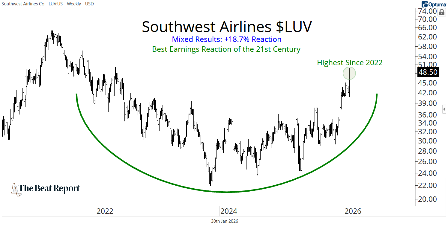 Everything about this report was fantastic, but the market's reaction was even better. Not only is the price decisively resolving a prolonged bearish-to-bullish reversal pattern, but it's doing so on the heels of the best earnings reaction of the 21st century. In other words, there's no debating that the technicals and fundamentals are aligned in strong primary uptrends. Based on this, we expect LUV to outperform its peers for the foreseeable future. |