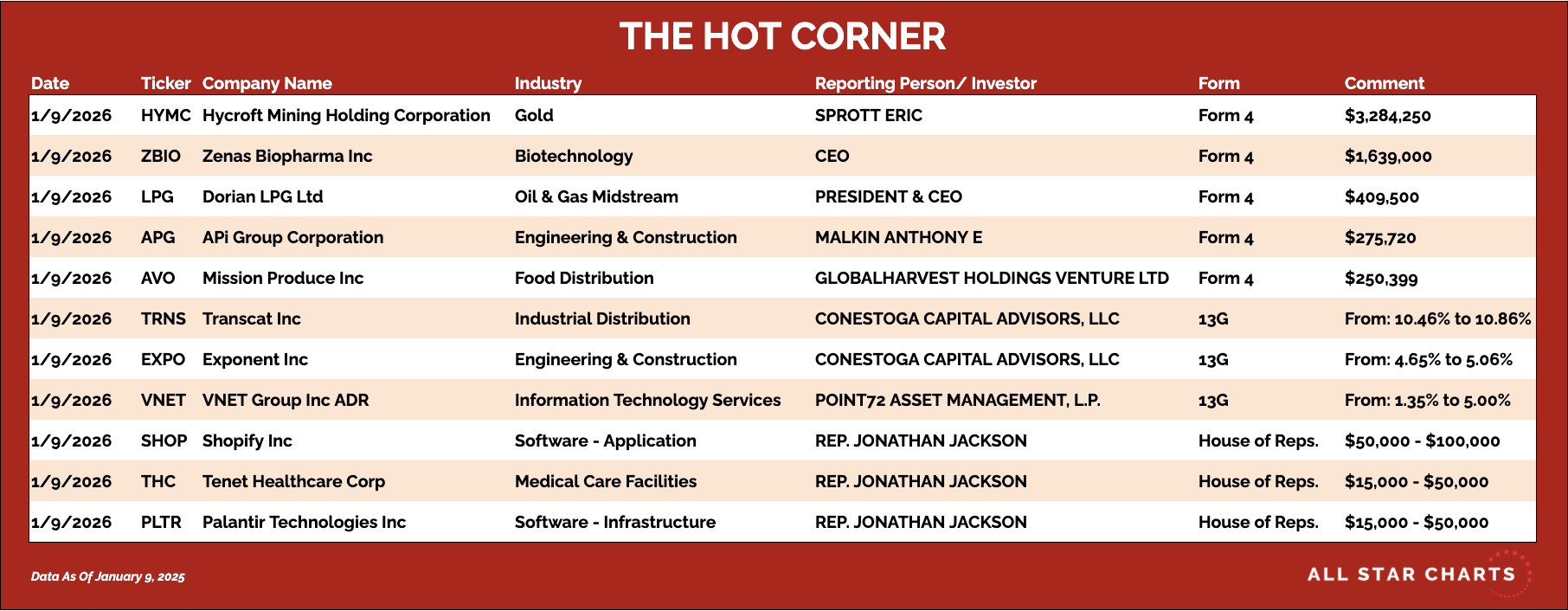 C-suite adding exposure as the stock tries to emerge from a bearish-to-bullish reversal. Here's The Hot Corner, with data from January 9, 2026: |