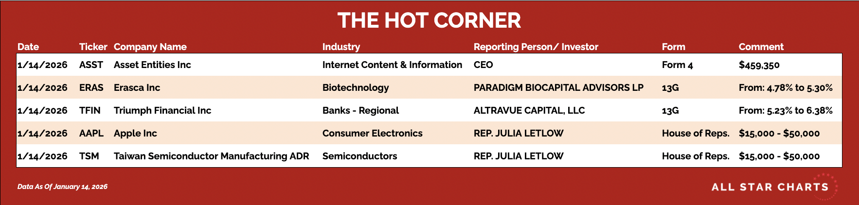 Every day, we sift through the filings to spot where the real conviction lies – cutting through the noise to highlight the most meaningful insider moves. 📌 Asset Entities $ASST — CEO disclosed a $459,350 purchase per a new Form 4. Insider buying continues to cluster in this thin, politically linked crypto-treasury vehicle. Despite the activity, price remains firmly embedded in a broader downtrend. 📌 Erasca $ERAS — Paradigm BioCapital increased its 13G stake from 4.78% to 5.30%. Specialist biotech capital adding incrementally in a name that has already advanced more than 4x over the past twelve months. Here's The Hot Corner, with data from January 14, 2026: |