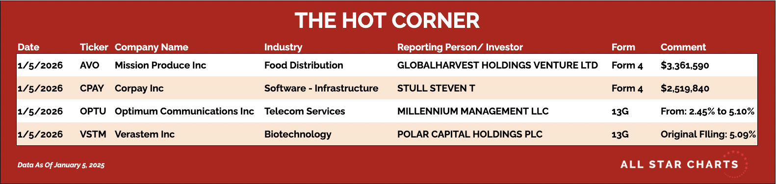 That is a real insider check in a large-cap payments workflow name. A standout buy in a messy chart. Here's The Hot Corner, with data from January 5, 2025: |