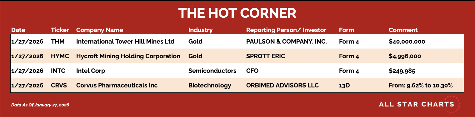 Every day, we sift through the filings to spot where the real conviction lies – cutting through the noise to highlight the most meaningful insider moves. 📌 International Tower Hill Mines $THM — Paulson & Co disclosed a $40 Million purchase via Form 4. A conviction-sized add in a thinly traded gold microcap. Clear signal that Paulson is leaning hard into precious metals optionality. Is this the next HYMC? 📌 Hycroft Mining $HYMC — Eric Sprott bought $4.996 Million per a new Form 4. Another aggressive add from Sprott, reinforcing persistent accumulation as price extends its parabolic advance. Here's The Hot Corner, with data from January 27, 2026: |