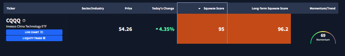 China Technology ETF $CQQQ is currently exhibiting a Squeeze Score of 95.2 and an even tighter Long-Term Score of 96.2. Here's what the chart looks like: |