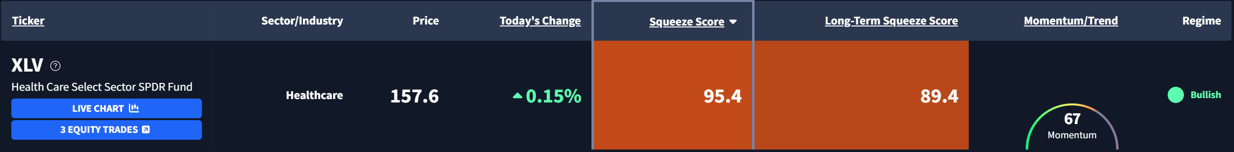 The Health Care Sector ETF $XLV is currently exhibiting a Squeeze Score of 95.40 and a Long-Term Squeeze Score of 89.40. Here's what the chart looks like: |