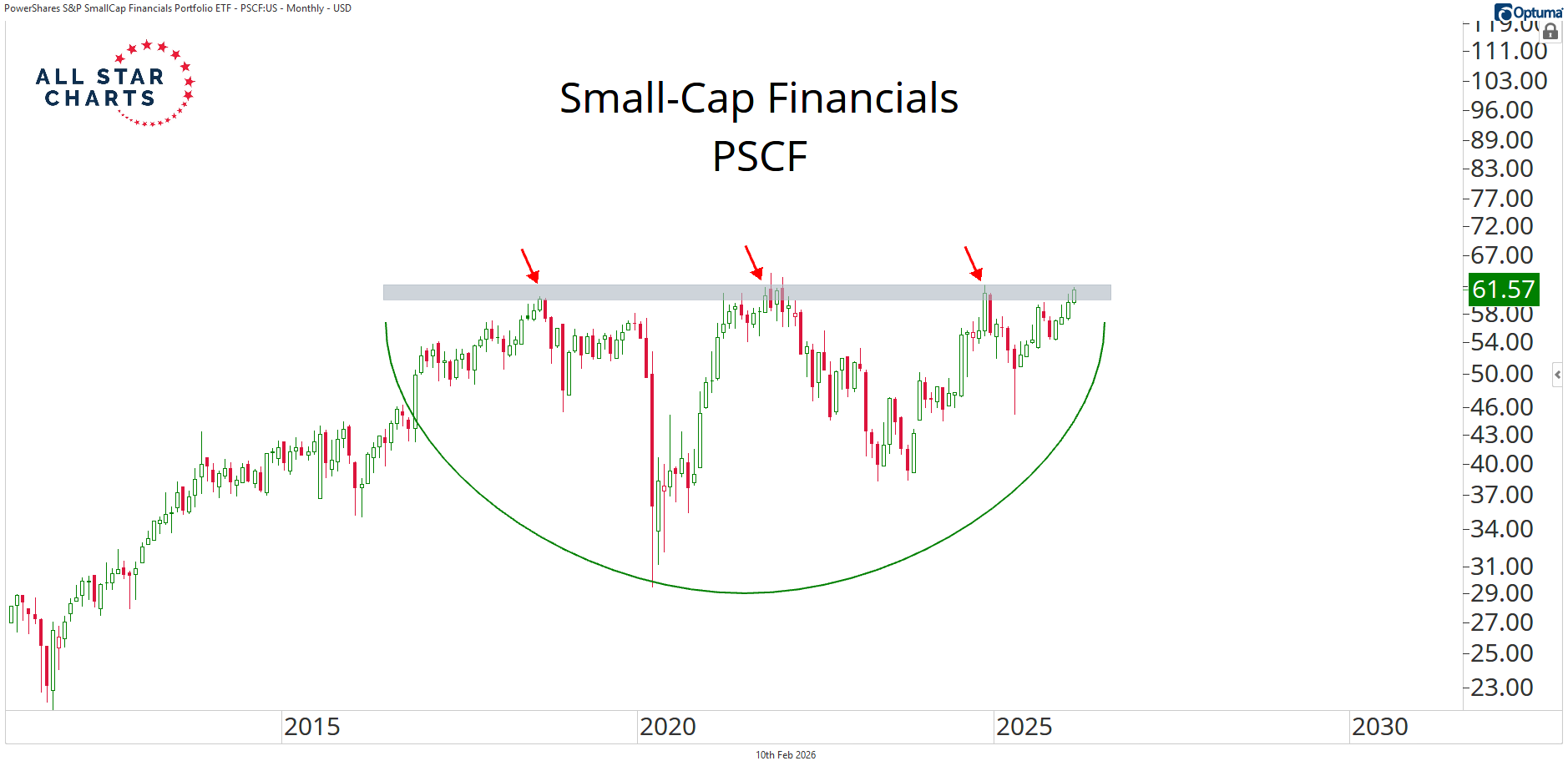 Small-Cap Financials on the Brink The weight of the evidence in small caps keeps pointing in the same direction: higher. The Russell 2000 has already completed a 4-year base and broken out to new all-time highs. When you break it down sector by sector, the underlying strength becomes even clearer. Small-cap Industrials look great. Small-cap Tech is pushing toward new highs. Materials have gone near-parabolic, and even Biotech has been quietly working for some time. But there's one key group that hasn't made its move yet: Small-cap Financials. And that's what makes this so interesting. Small-cap Financials are now pressing against the upper bounds of an 8-year base. |
