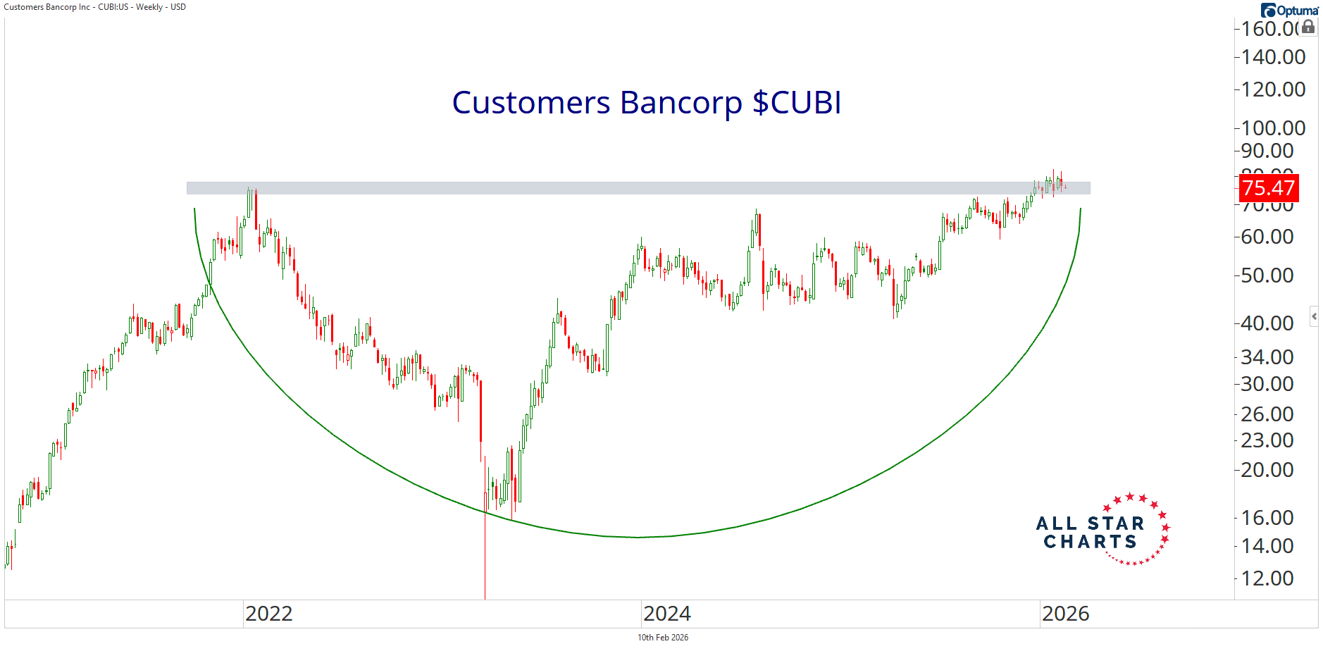 Check out that base. Risk is clearly defined at those former 2022 highs, giving a clean level to manage against. I only like to take a long position in CUBI if and only if we break above 78. Alfonso De Pablos, CMT Director of Research, All Star Charts |