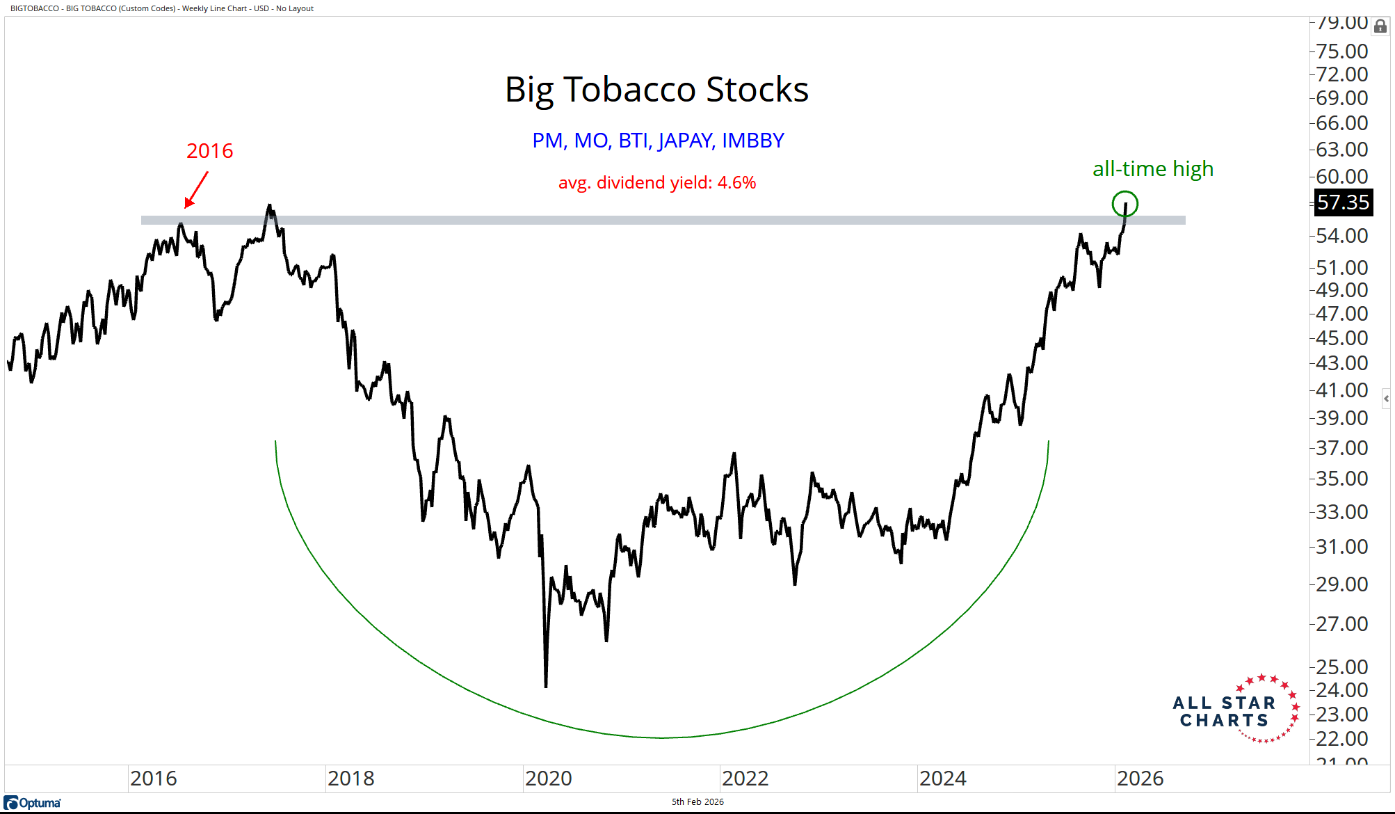 Here's our Big Tobacco Index printing fresh all-time highs, breaking out of a decade-long base: |