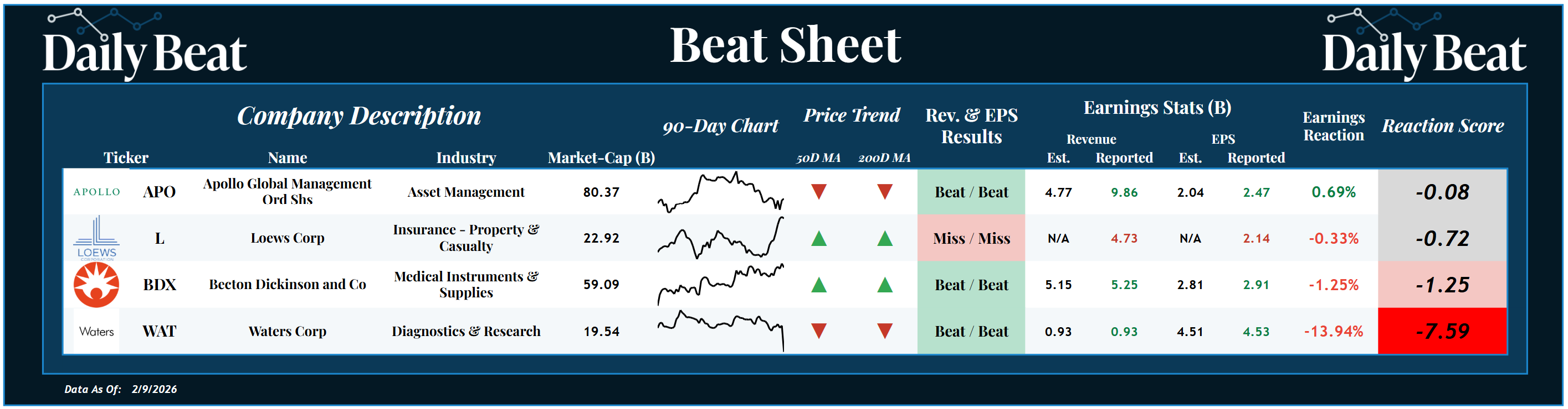 *Click the image to enlarge it At the top of Monday's Beat Sheet was the $80B asset management stock, Apollo Global Management $APO. After posting a double beat, the stock had a slightly negative reaction score. APO reported $9.86B in revenue, beating the expected $4.77B, and earnings per share of $2.47, beating the expected $2.04. At the bottom of Monday's list was the $20B diagnostics and research stock, Waters $WAT. Following a double beat, shareholders were punished with a -7.59 reaction score. WAT's revenues came in at $930M, meeting the market's expectations, and earnings per share of $4.53, beating the expected $4.51. The beat/beat/drop from Becton Dickinson $BDX also stood out to us. Let's talk about what else happened 👇 |