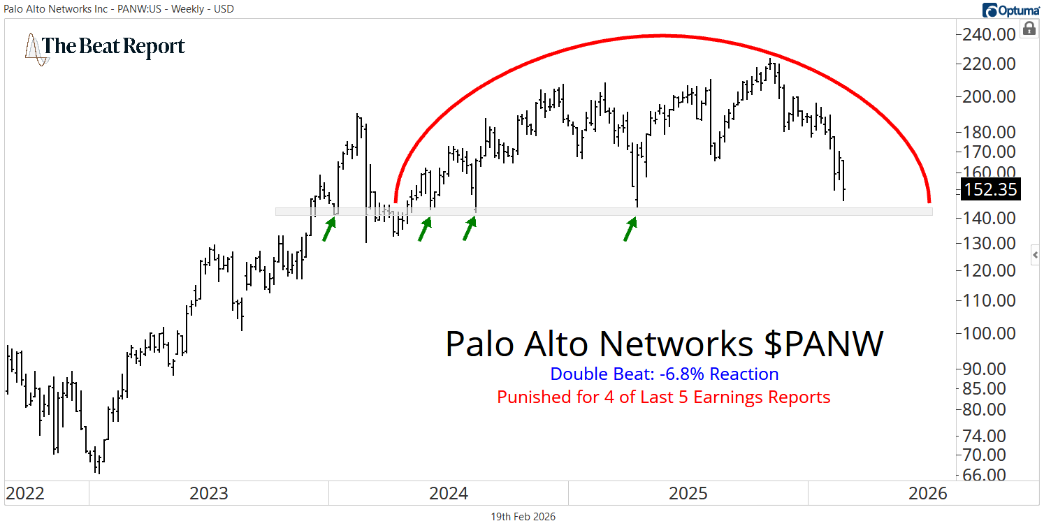 While this quarter's earnings reaction wasn't good, it was nothing out of the ordinary. For over a year, the market has been consistently punishing shareholders for this company's earnings events. The technicals are confirming this negative earnings sentiment as the stock is carving out a massive distribution pattern. Until something significantly changes, the path of least resistance for PANW is lower for the foreseeable future. Happy fishing -The Beat Team |