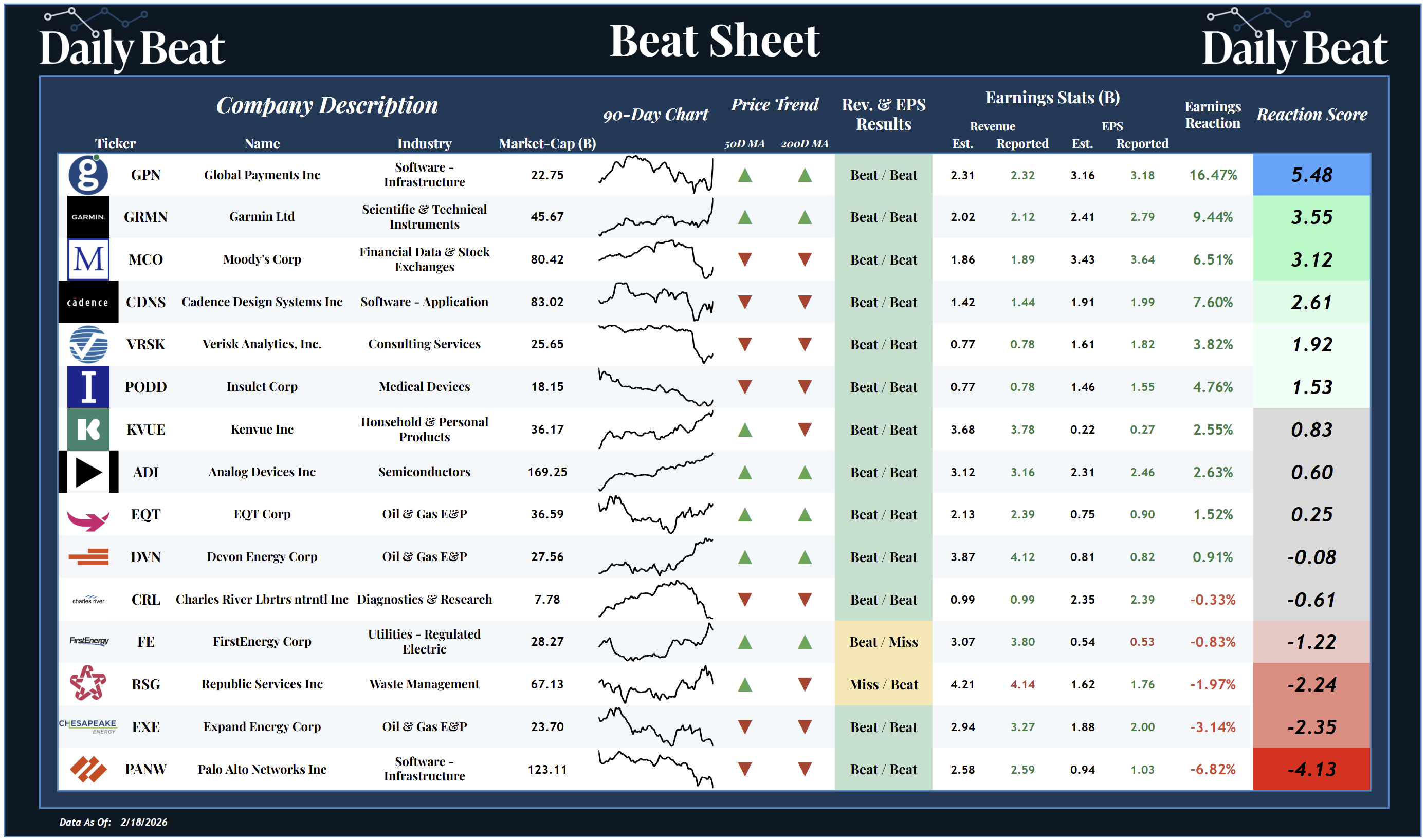*Click the image to enlarge it At the top of Wednesday's Beat Sheet was the $23B software stock, Global Payments $GPN. The company beat expectations across the board, and shareholders were rewarded with a +5.48 reaction score. GPN reported $2.32B in revenue, beating the expected $2.31B, and earnings per share of $3.18, beating the expected $3.16. At the bottom of Wednesday's list was the $123B cybersecurity stock, Palo Alto Networks $PANW. Following a double beat, shareholders were punished with a -4.13 reaction score. PANW's revenues came in at $2.59B, beating the expected $2.58B, and earnings per share of $1.03, beating the expected $0.94. Let's talk about what else happened 👇 |