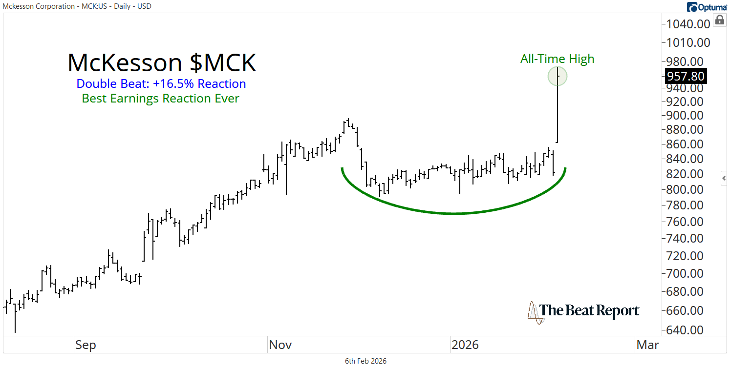 Since bottoming in April 2025, McKesson has surged higher by over 100%. It has been one of the best healthcare stocks in the S&P 500. Heading into the price, volatility was in one of the tightest compressions we've seen in years. It was clear that a big move was coming; we just didn't know which way. As it turns out, the consolidation resolved in the direction of the underlying technical and fundamental trend. And it couldn't have done so in a more decisive way. The stock just had its best earnings reaction ever. With strong technical and fundamental momentum, we expect MCK to continue trending higher for the foreseeable future. |